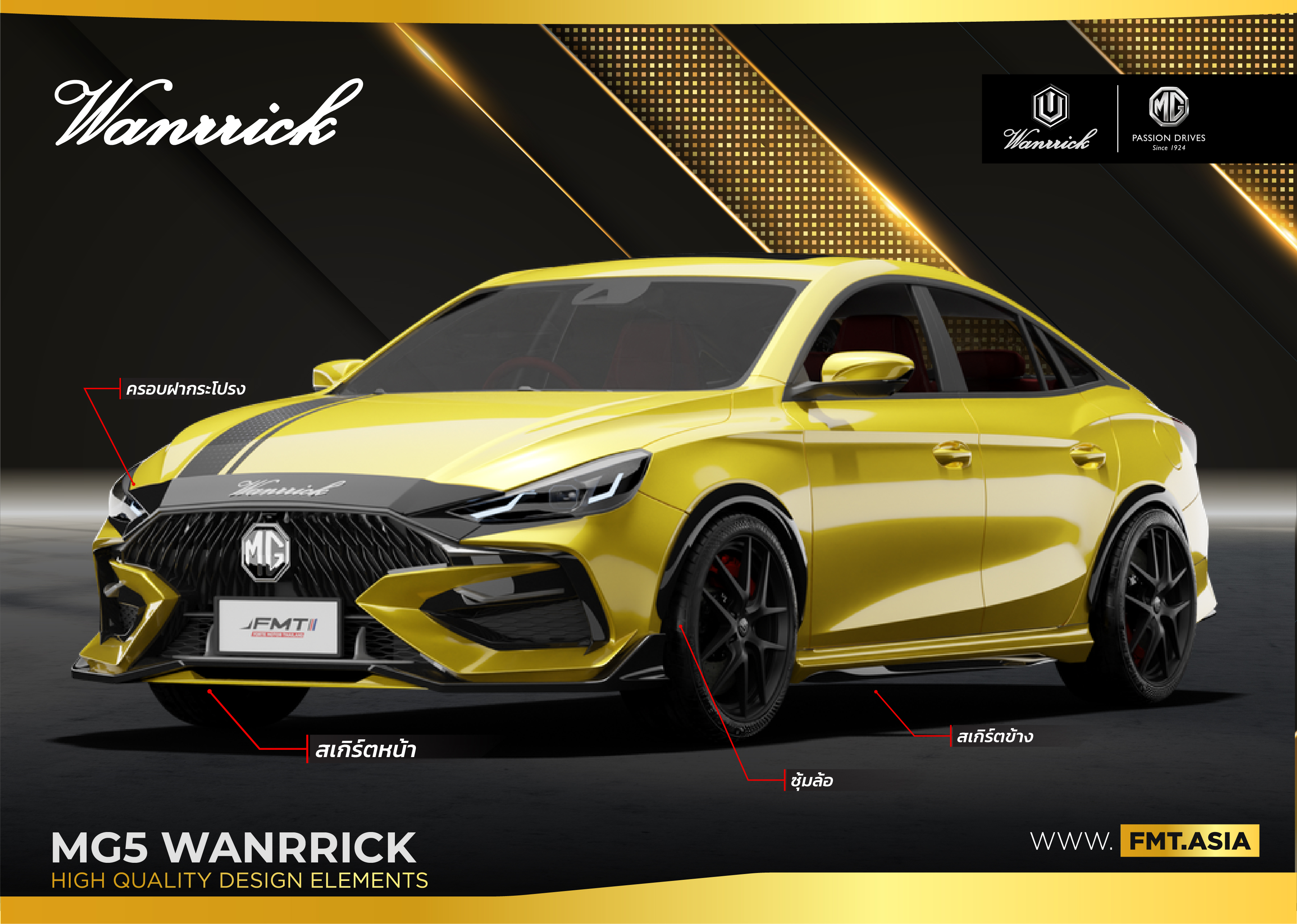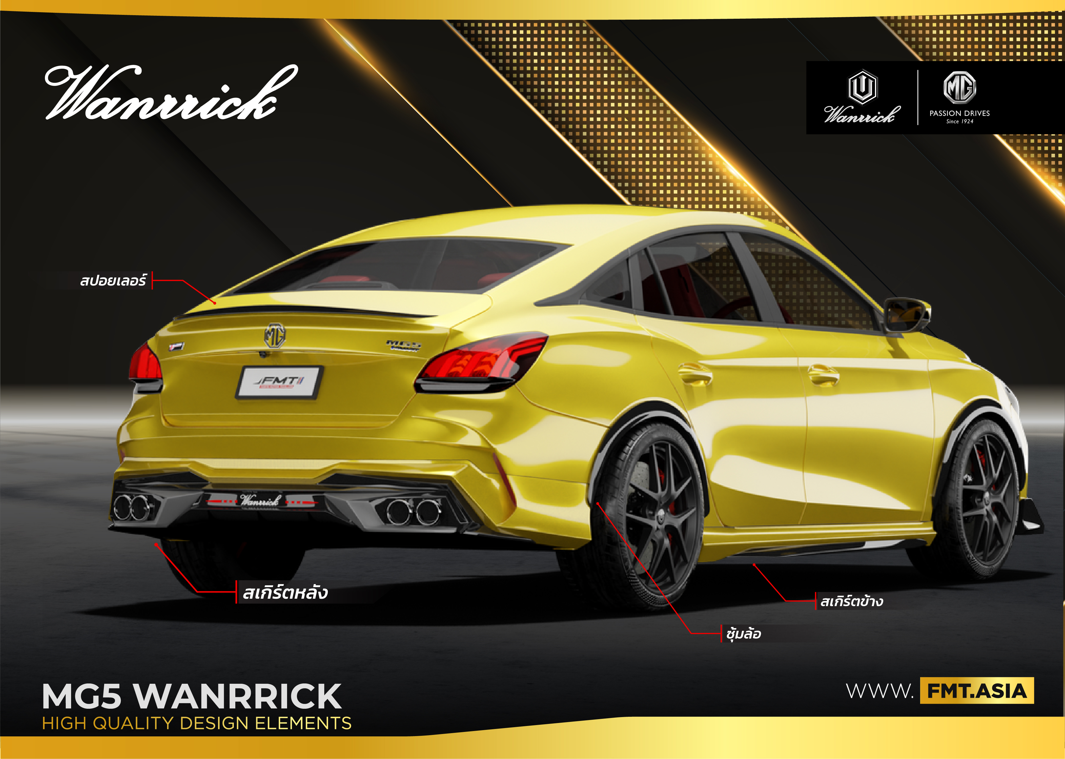 ชุดแต่ง MG5 WANRRICK 2021 FMT by WANRRICK ทั้งหมด ชุดจัดเต็ม 10 ชิ้น สเกิร์ตรอบคัน+สปอยเลอร์+คิ้วกระจัง พร้อมชื่อWanrrick + ซุ้มล้อ รถสปอร์ตแนวคูเป้ เสริมด้วยชุดแต่ง wanrrick สเกิร์ตหน้าสไตล์ Luxury ผสมผสาน ความ Sport ด้วยสเกิร์ตหลังท่อคู่ พร้อมจบครบทุกความเรียบหรูด้วย “แต่งรถถูกใจ ตามสไตล์ ชุดแต่ง WANRRICK ตามสไตล์ของคุณ”