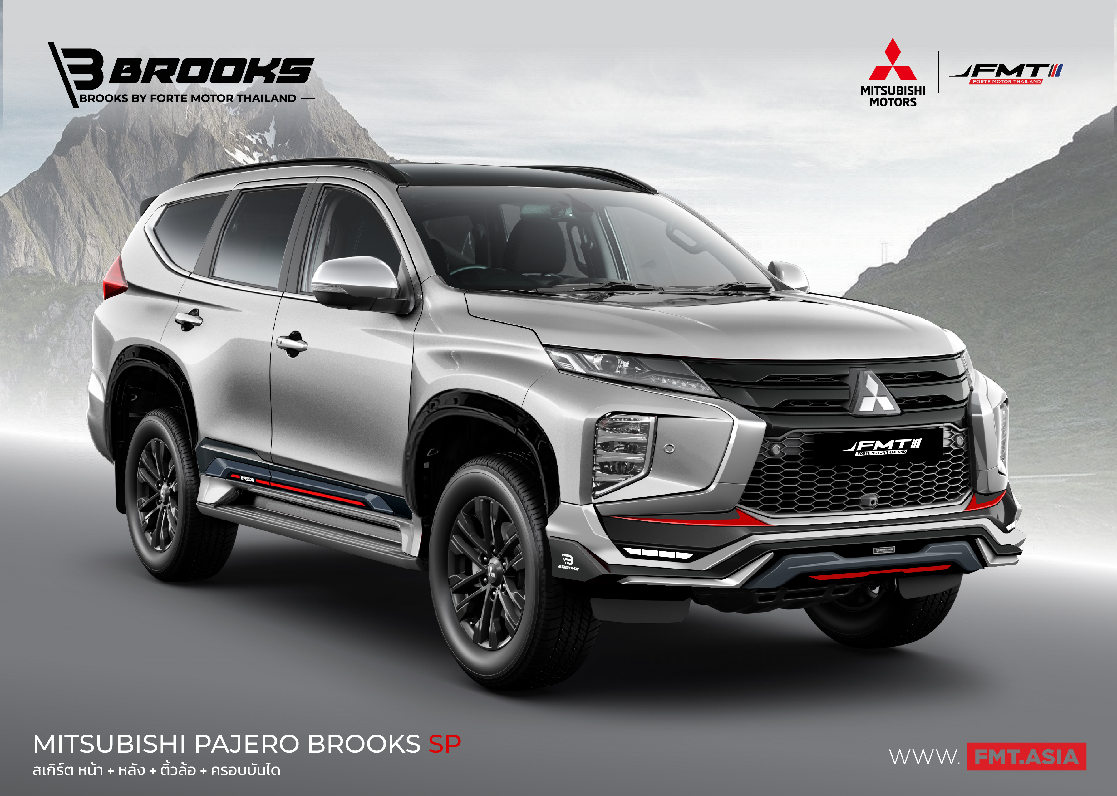 มิตซูบิชิ ปาเจโร สปอร์ต FMT by ชุดแต่ง BROOKS กล้าที่จะต่าง เพื่อค้นพบสิ่งใหม่ๆ ด้วยชุดแต่งรอบคัน สเกิร์ตหน้า สเกิร์ตหลัง ซุ้มล้อ กาบข้างประตู รวม 10 ชิ้น สู่อีกขั้นของความสมบูรณ์แบบ ด้วยดีไซน์อันโดดเด่น สะดุดทุกสายตา Mitsubishi Pajero by BROOKS