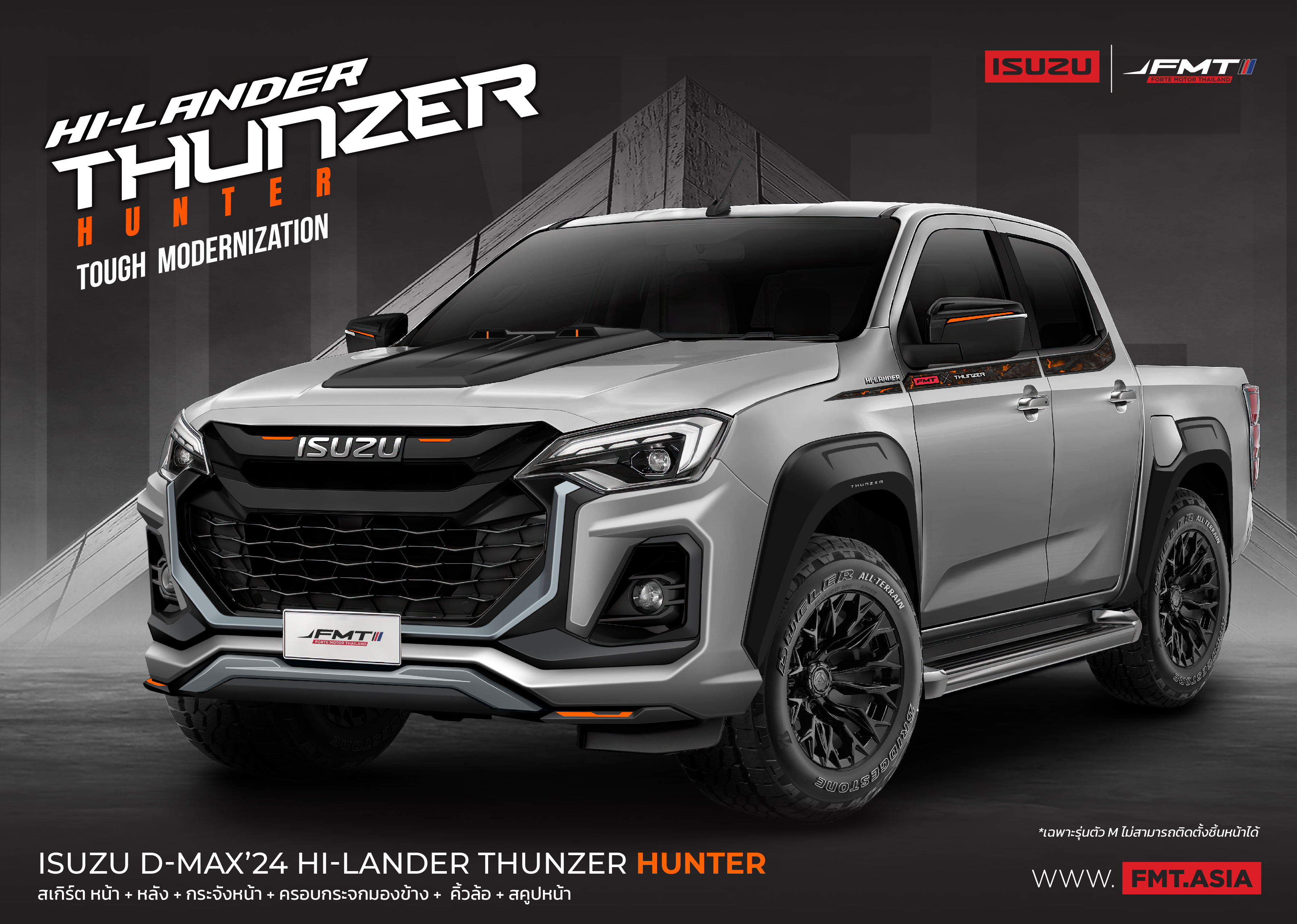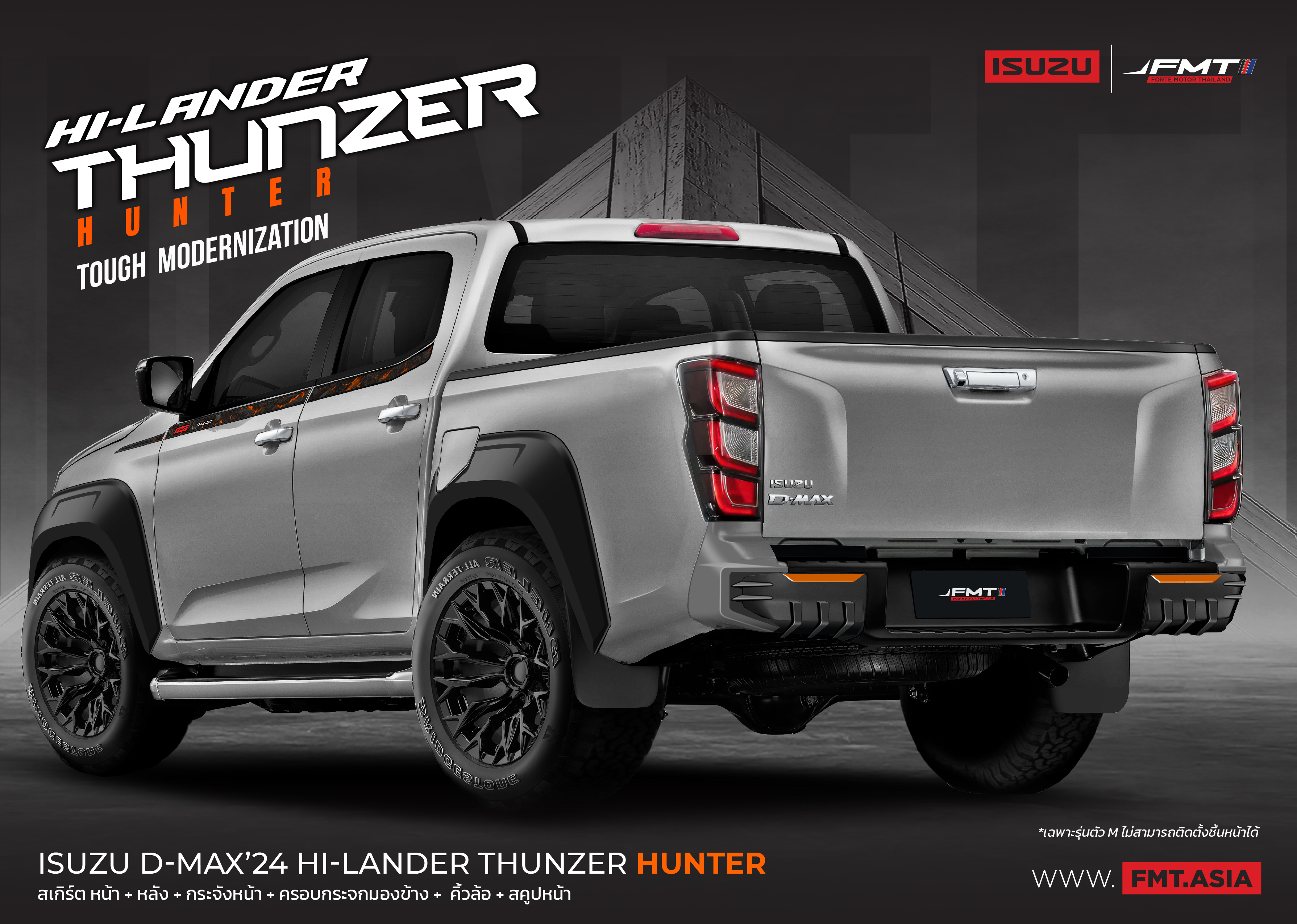 ใหม่ล่าสุด กับดีไซน์ D-max THUNZER รุุ่น HUNTER Hi Lander ที่มีทั้งหมด 11 ชิ้น ประกอบไปด้วยสเกิร์ตหน้าตัดด้วยเส้นสีส้มสท้อนแสงในเวลากลางคืน และ สเกิร์ตด้านหลังดีไซน์แบบดิฟฟิวเซอร์เท่ๆ และซุ้มล้อ สีด้าน ติดตัวอักษร THUNZER สะท้อนแสง