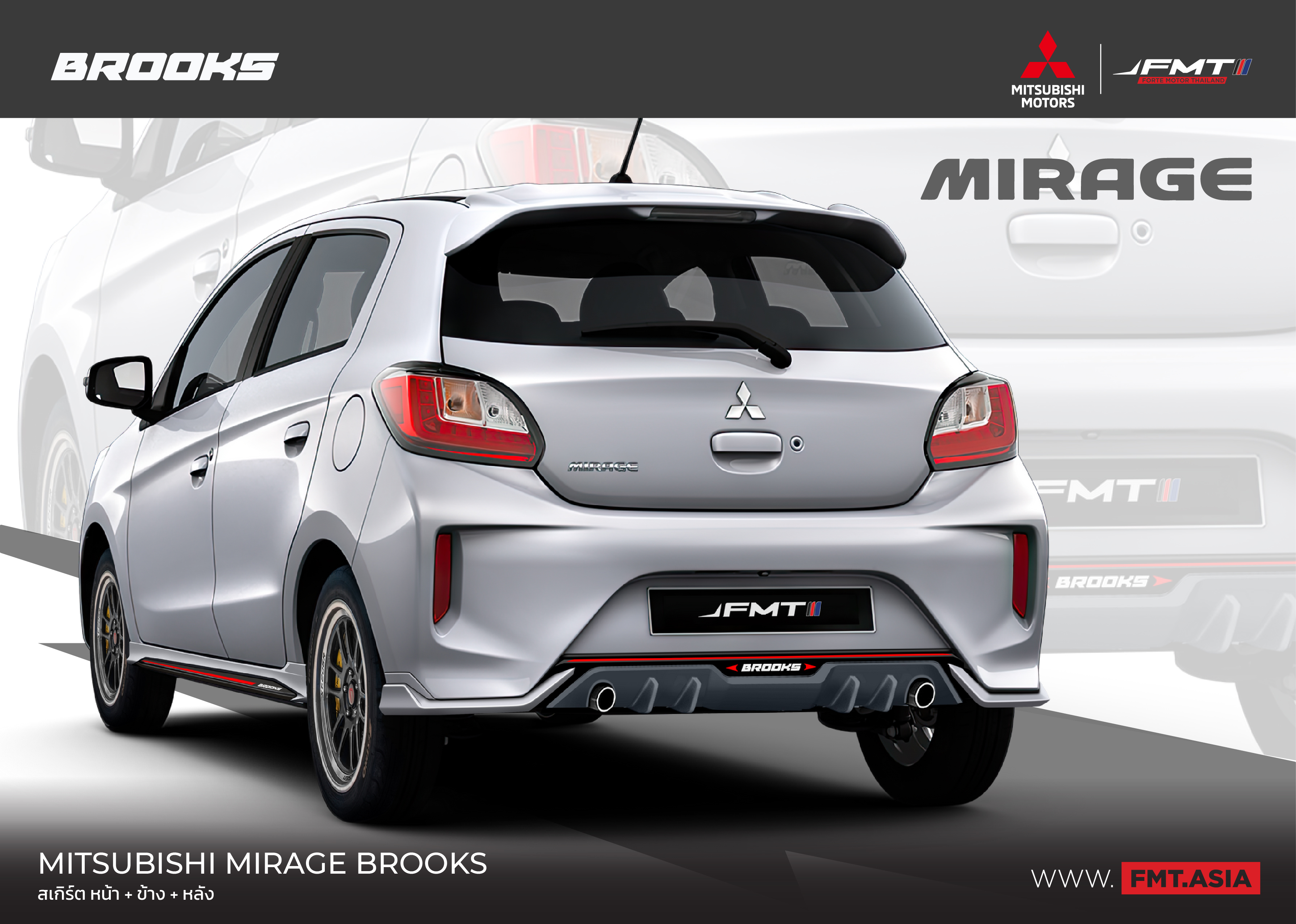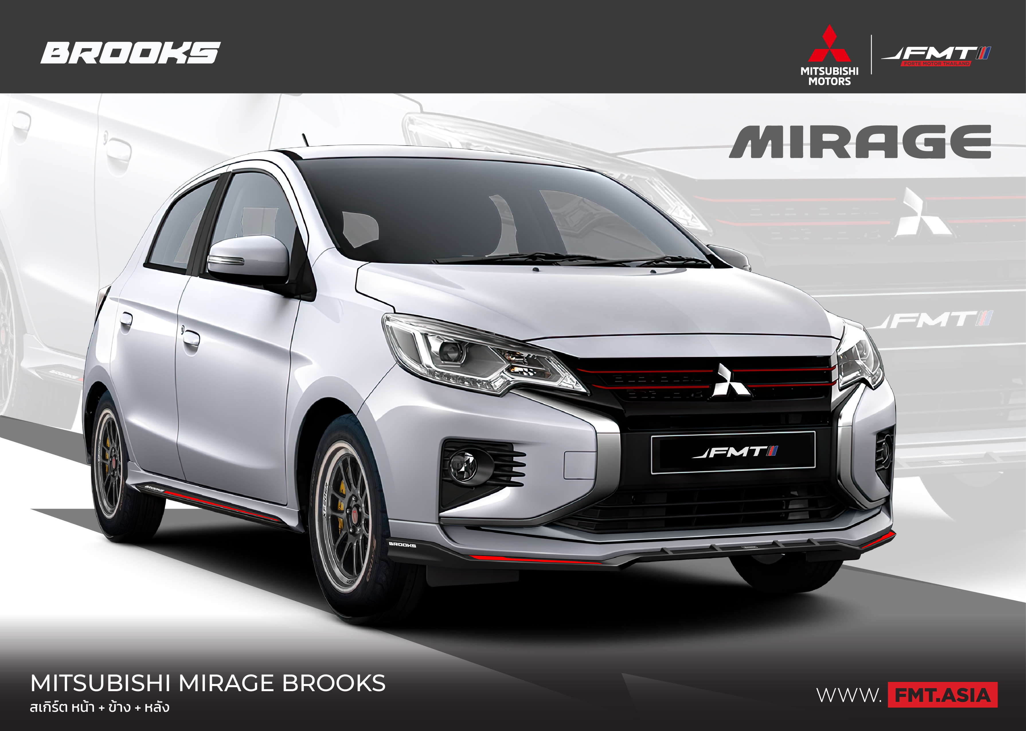 ชุดแต่ง Mitsubishi Mirage by BROOKS จัดเต็มครบเซต 4 ชิ้น รอบคัน สเกิร์ตชิ้นหน้า สเกิร์ตข้าง สเกิร์ตหลัง แต่งเฟี้ยว สะท้อนตัวตนในแบบคุณ กับอุปกรณ์ตกแต่ง FMT by BROOKS รอบคัน ดุดัน อึด เอาอยู่ ชุดแต่ง Mitsubishi by BROOKS
