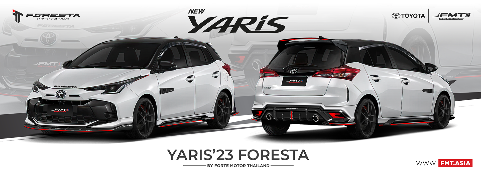โฉมใหม่ล่าสุดกับตัว 5 ประตู YARIS HATCHBACK มีทั้งหมด 15 ชิ้น สเกิร์ตหน้า สเกิร์ตหลัง สเกิร์ตข้าง สปอยเลอร์ ฮู๊ดข้างประตู เบ้ามือจับประตู คิ้วกันสาด โลโก้ 3D Foresta ที่ดีไซน์ออกมาสปอร์ตหรูหรา มีเอกลักษณ์ ทำให้สะกดทุกสายตาบนท้องถนน