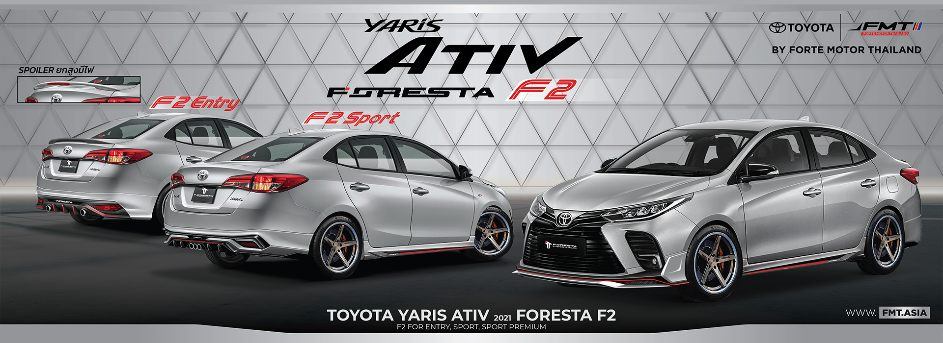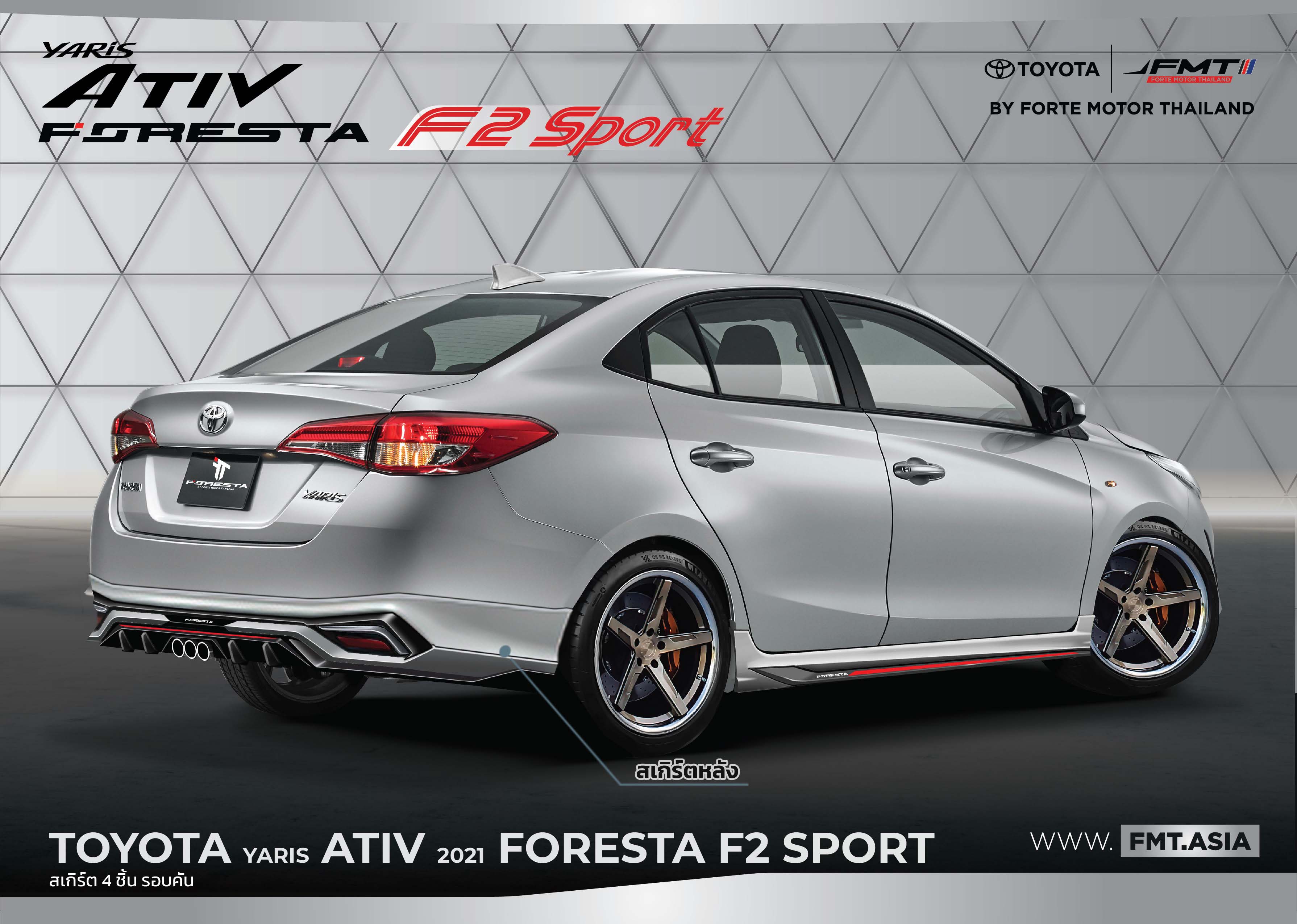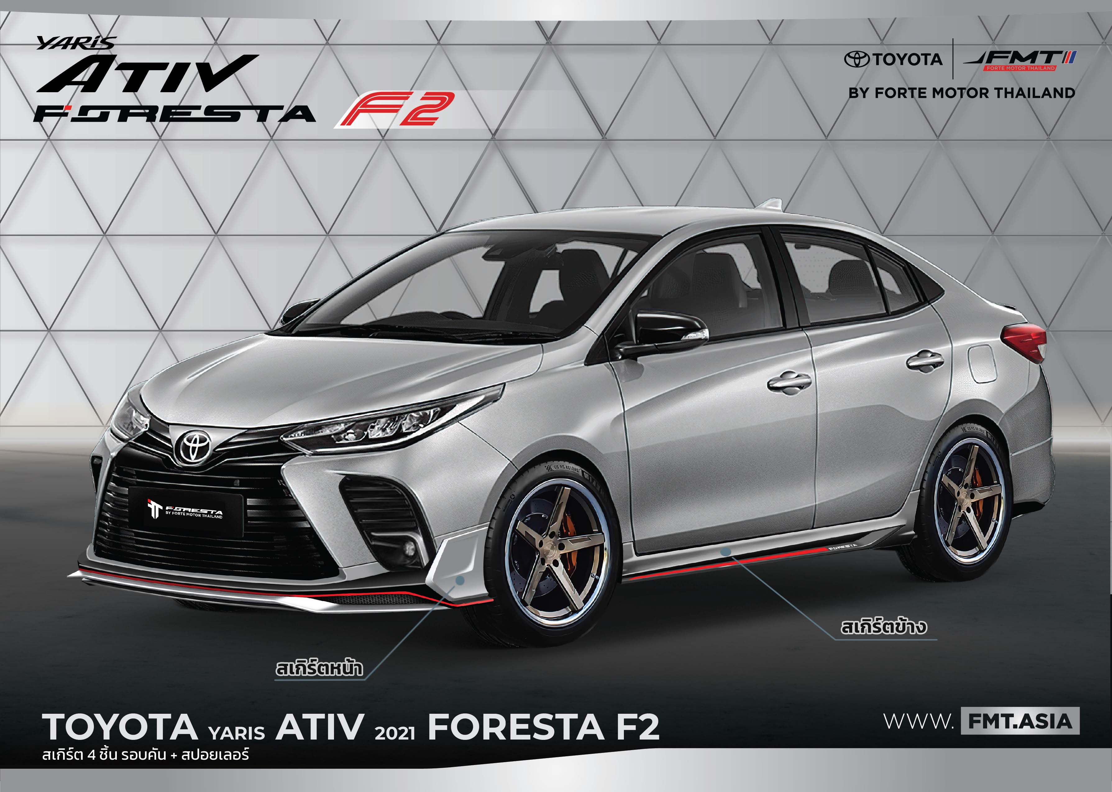 ให้โดดเด่นยิ่งขึ้นไปอีกระดับ ด้วยชุดแต่ง FORESTA เพื่อเน้นความเรียบหรูและสปอร์ต ผลิตจากวัสดุคุณภาพสูง ผ่านการดีไซน์อย่างพิถีพิถัน โดยมีเส้นสีแดงที่ตัดกับตัวสีรถ ที่ทำให้ตัวสเกิร์ตรอบคัน ดูโดดเด่นมากยิ่งขึ้น พร้อมสปอยเลอร์แบบยกและ แบบแนบ