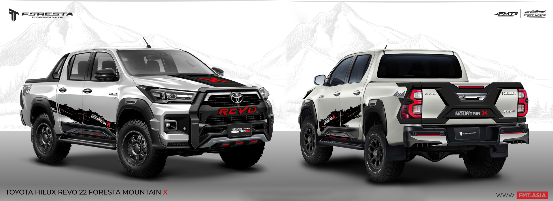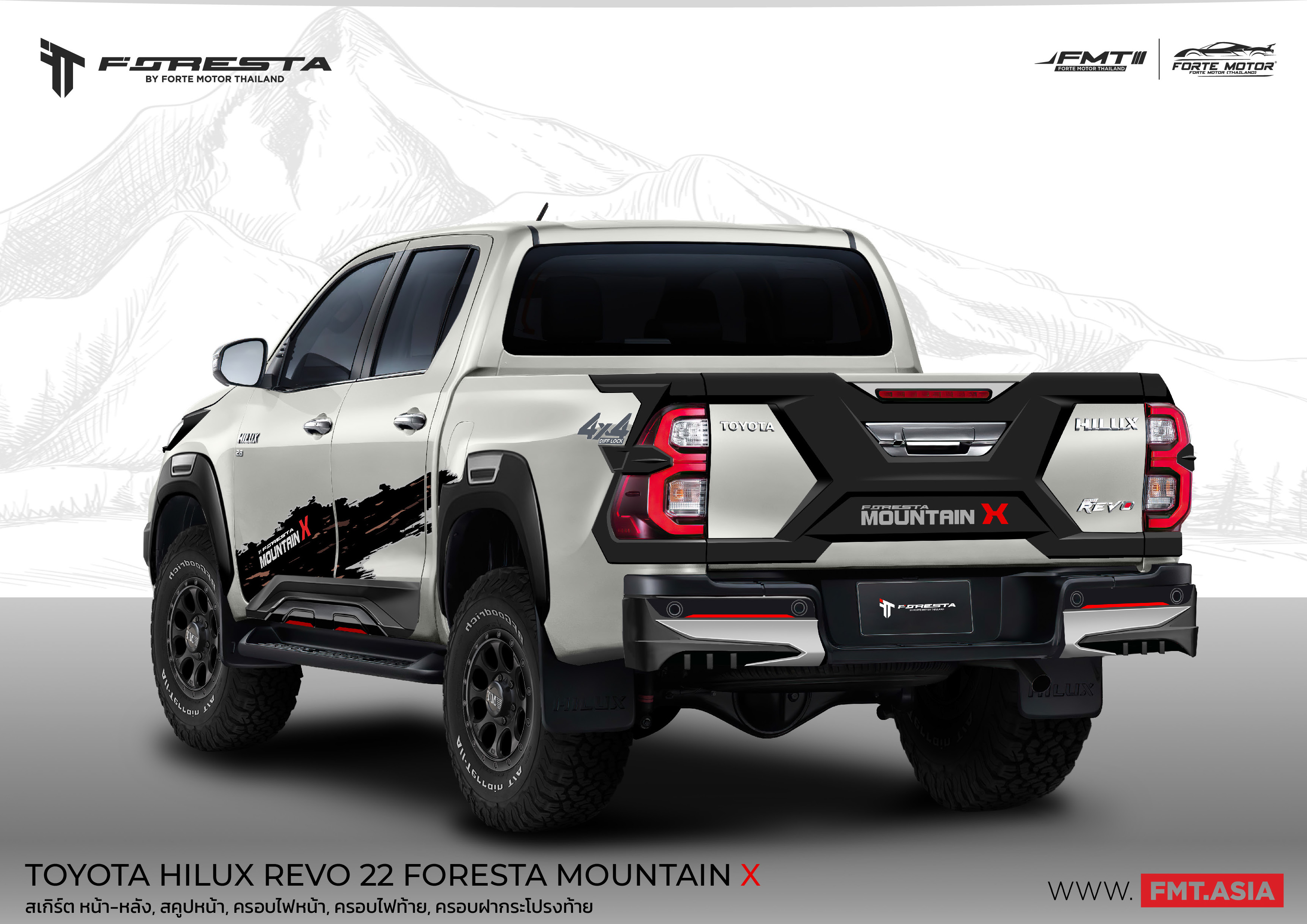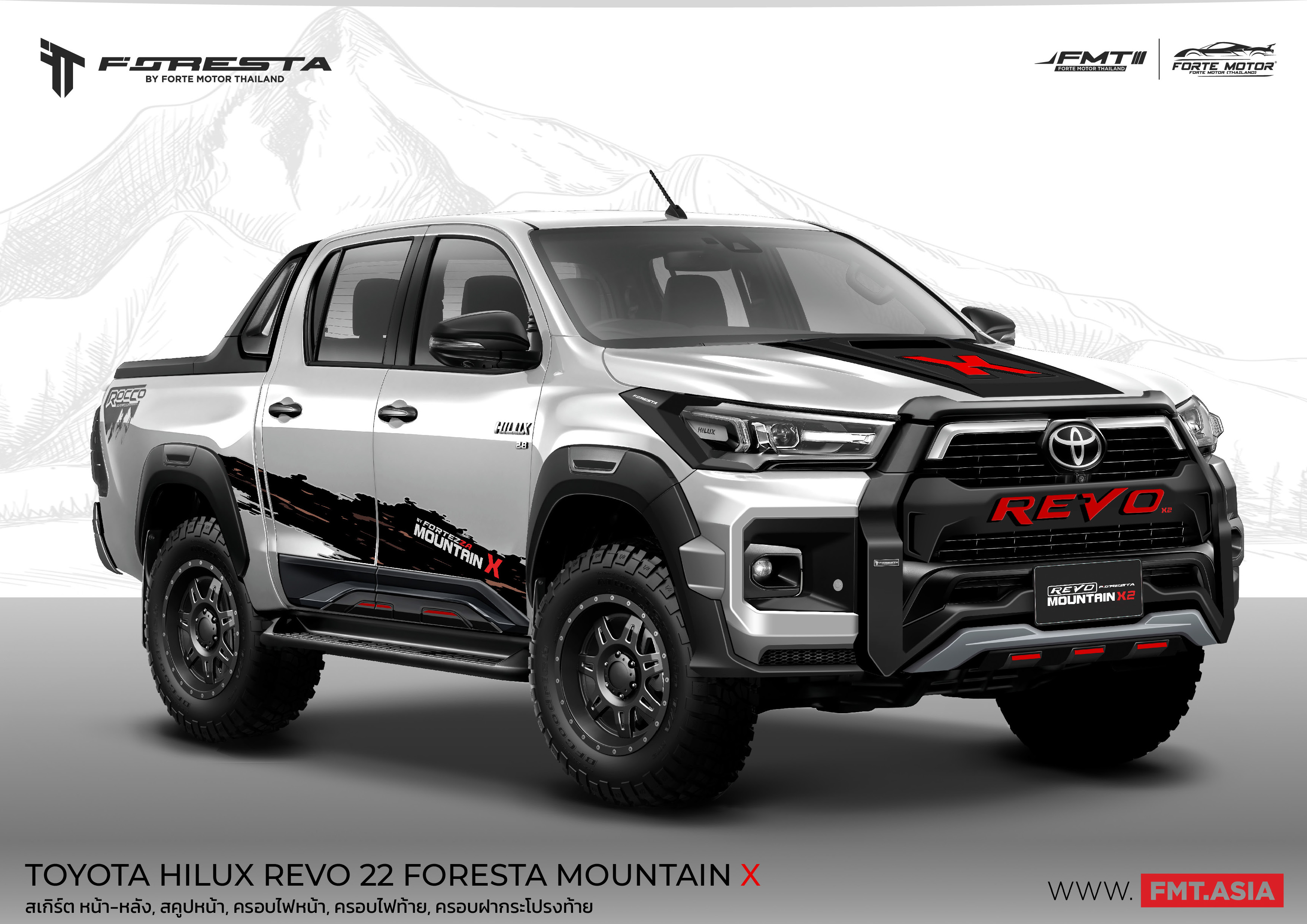 โตโยต้า ไฮลักซ์ รีโว่ 2022 มาพร้อมชุดแต่ง FORESTA MOUNTAIN X TWOเพิ่มความมั่นใจทุกเส้นทางด้วยชุดแต่งรอบคัน สเกิร์ตชิ้นหลัง ครอบไฟหน้า ครอบไฟท้าย กาบข้าง กาบท้ายและสกู๊ปหน้า รวม 15 ชิ้น ดีไซน์โฉบเฉี่ยว สปอร์ต ทันสมัย เหมาะกับสายลุย ต้องชุดแต่ง FORESTA #FMTbyFORESTA